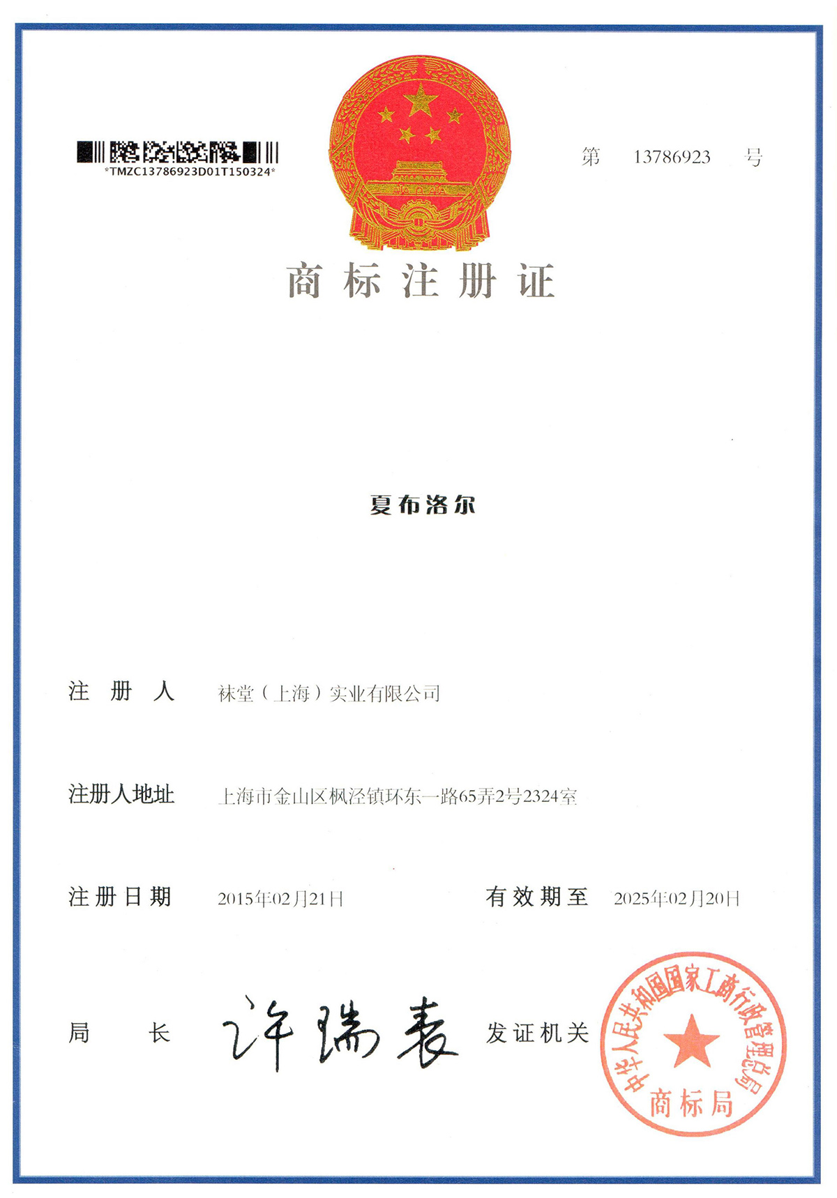 夏布洛尔-商标注册证